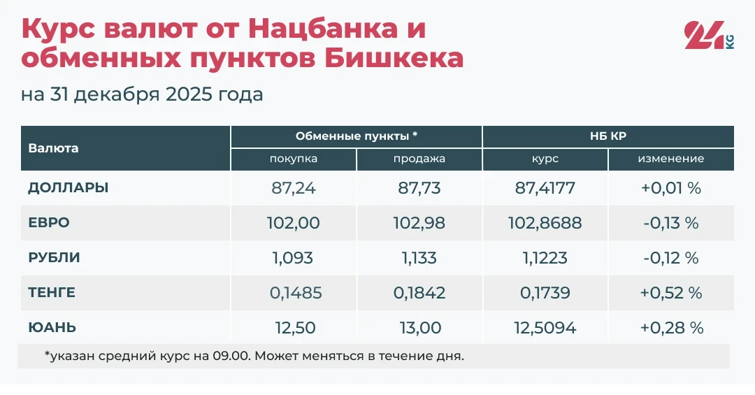 - Алмашуу пункттарындагы орточо курс: сатып алуу — 12,5 сом, сатуу — 13 сом.