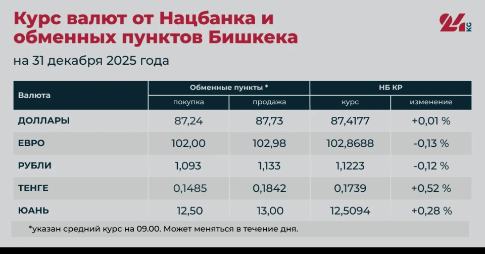 - Алмашуу пункттарындагы орточо курс: сатып алуу — 87,24 сом, сатуу — 87,73 сом.