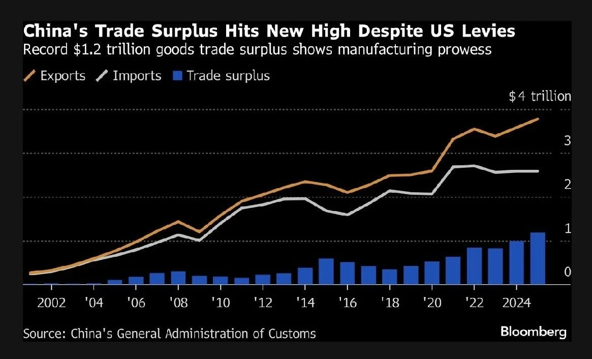 Мамлекеттик адистердин пикири боюнча, 2025-жылы Кытай тарыхтагы эң жогорку соода профицитине жетти, ал 2024-жылдагы көрсөткүчтөн 20%га жогору болду. Бул өсүш АКШ рыногунан Азия, Африка жана Латин Америкасынын өнүгүп жаткан өлкөлөрүнө экспортту кайра багыттоонун натыйжасында мүмкүн болду.