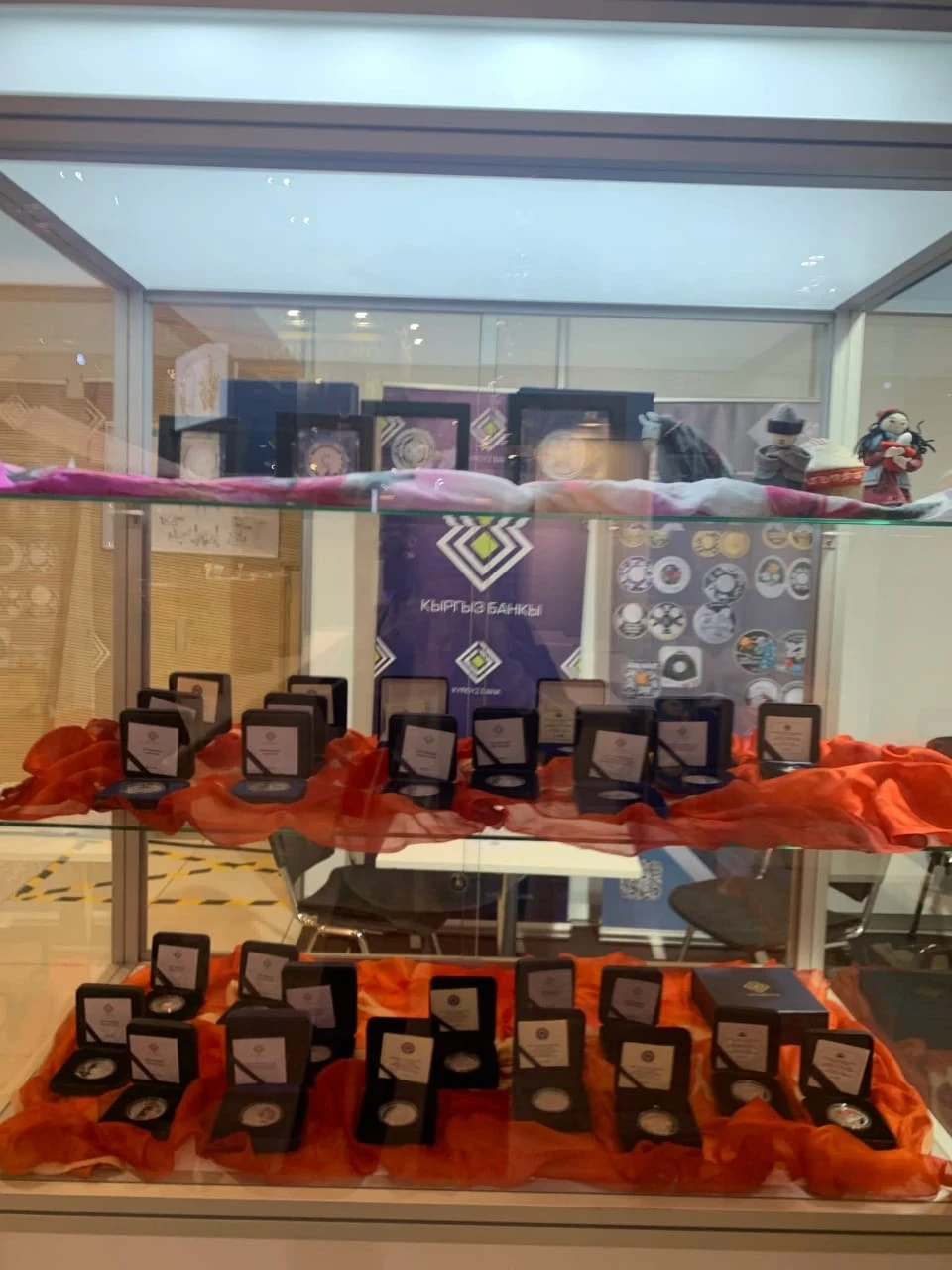 Экспозиция 30дан ашык банкнот жана коллекциялык монеталарды камтыды, алар «Тарыхый окуялар», «Кыргыз каганатынын доору», «Кыргызстандын тарыхый жана архитектуралык эстеликтери», «Кыргыздын салттары жана ырымдары», «Улуттук музыкалык аспаптар», «Улуттук спорт түрлөрү жана элдик оюндар», «Көчмөндөрдүн дүйнөлүк оюндары» жана «Кыргызстандын кызыл китеби» темаларын камтыйт.
