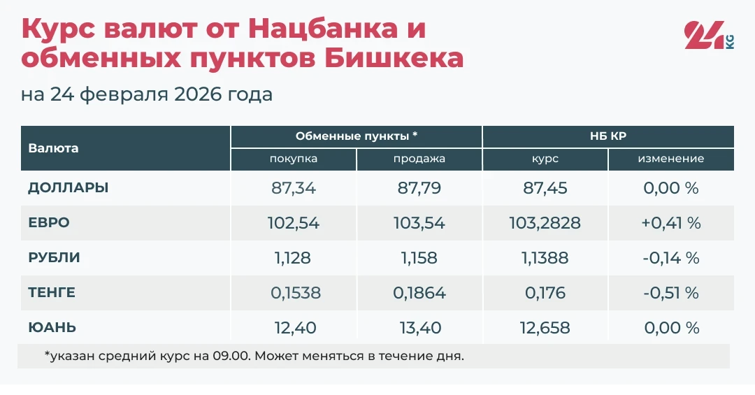 - Алмашуу пункттарындагы орточо маанилер: сатып алуу — 12,4 сом, сатуу — 13,4 сом.