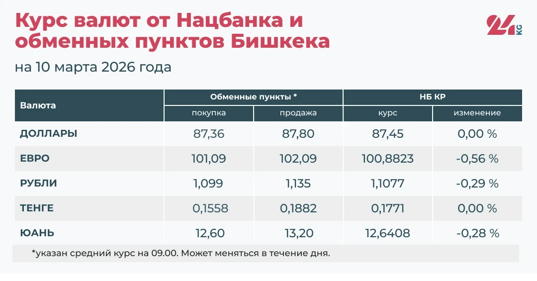 - Алмашуу пункттарында орточо курс: сатып алуу — 101,09 сом, сатуу — 102,09 сом.