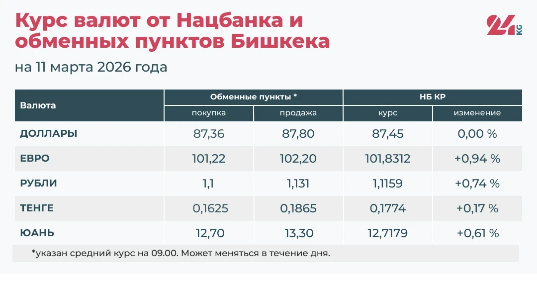 - Алмашуу пункттарындагы орточо курс: сатып алуу — 1,1 сом, сатуу — 1,131 сом.