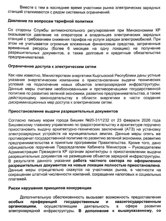Электр транспортко өтүү Бишкекте абанын булганышына каршы күрөшүүнүн негизги багыттарынын бири болуп саналат. Бийлик мурда «жашыл» демилгелерди жана бизнести колдоо зарылдыгын бир нече жолу баса белгилегенине карабастан, ишкерлер бюрократиялык тоскоолдуктар жана мамлекеттик мекемелер тарабынан адилетсиз атаандаштык менен көбүрөөк туш болушууда, деп айтылат ачык катта.