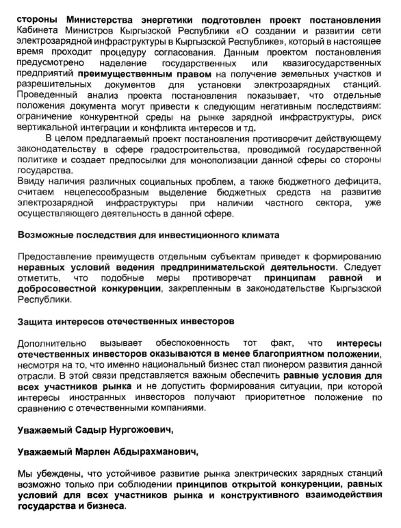 Каттагы маалыматка ылайык, монополияга каршы кызмат ишкерлерден заряддоо кызматтарынын баасын төмөндөтүүнү талап кылууда, бул учурда бизнесдин финансылык чыгымдарын жана карыздык милдеттенмелерин, ошондой эле уруксаттарды алуу менен байланышкан бюрократиялык кыйынчылыктарды эске албай жатат (бир документти даярдоого алты айдан ашык убакыт кетет).
