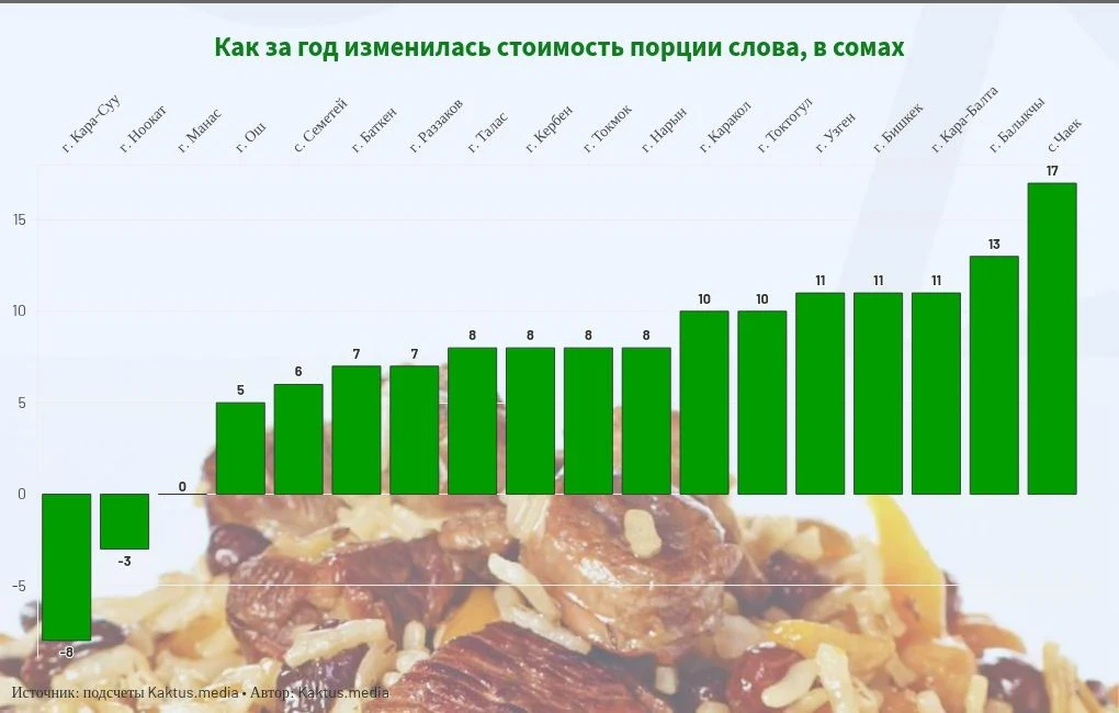 Орозо айта жана Ноорузга даярдык көрүү алдында, Kaktus.media өлкөнүн ар кайсы бурчтарында плов даярдоонун канча турарын жана анын бааларынын жыл ичинде кандай өзгөргөнүн аныктоо үчүн изилдөө жүргүздү.