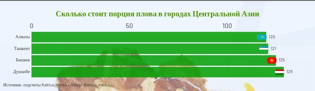Биз ошондой эле коңшуларыбызда пловдун порциясынын канча турарын аныктоону чечтик. Бул үчүн Ташкент, Алматы жана Душанбе шаарларында күрүч, сиыр эти, сабиз, пияз жана өсүмдүк майынын баалары боюнча Улуттук статистикалык комитеттердин маалыматтары жана ачык булактар пайдаланылды.