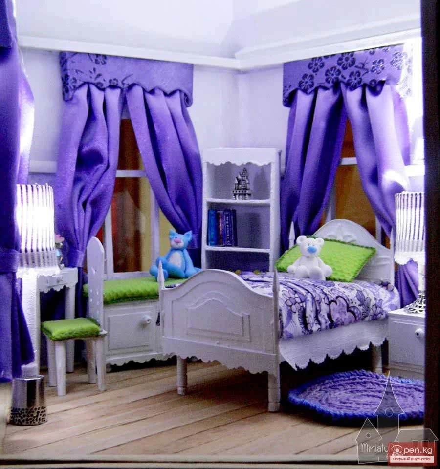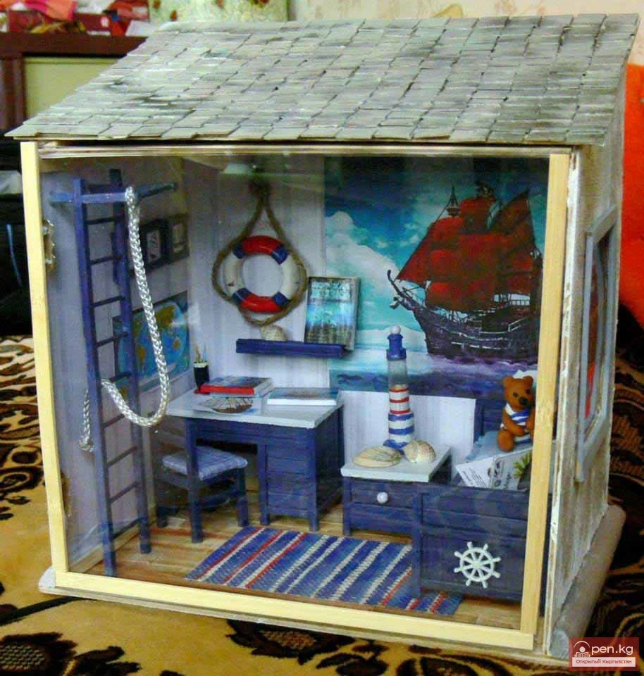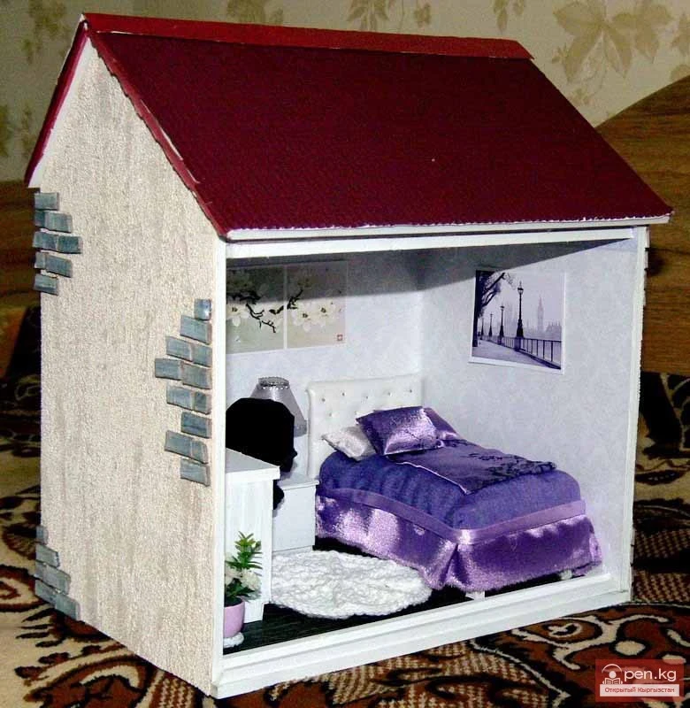 - Чындыкта - бул абдан кылдат иш. Бардыгы коробкадан башталат, ал менин көз карашым боюнча эмне болушу керек экенин толтурат. Мебель жасоодо мен тыгыз картонду колдонуп, аны оңой эле желимдеп, андан кийин боёп алам. Чиймелерди интернеттен чыгарып же чыныгы чиймелерди колдонуп, алар түстөрү жана текстурасы боюнча ылайыктуу болушу керек. Бир жумадан бир айга чейин дизайнердин тырышчаактыгы менен ар кандай майда деталдарды иштеп чыгууга туура келет. Мен жаңы үйчүк жасаганда, процесс мага абдан чоң ырахат тартуулайт. Анткени мен ар бир интерьер буюмуна жанымды салам жана ар бир керебет, жарык же аюу биринчи кезекте мени кубандырышы керек. Бул кичинекей бөлмөдө мен жыгаччы, боёочу жана электрчи болуп жатам. Мен дээрлик бардык курулуш адистиктерин өздөштүрдүм. Специальный пластилинди колдонуп, мен үйчүктү ар кандай оюнчуктар жана майда деталдар менен толтурам, аларды алдын ала бышырып. Интерьерди толтургандан кийин мен үйчүктүн сырткы жасалгасы менен алектенем, даже черепицаны кол менен кесип, боем. Мен майда деталдарды устаттар үчүн атайын дүкөндөн сатып алам, ал жерде румбоксторго дагы да реалистик көрүнүш берүүчү майда деталдар сатылат. Бул жерде кичинекей вилкалар, кашык жана чөйчөктөрдү да сатып алса болот.