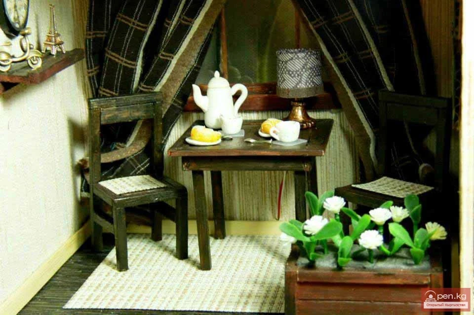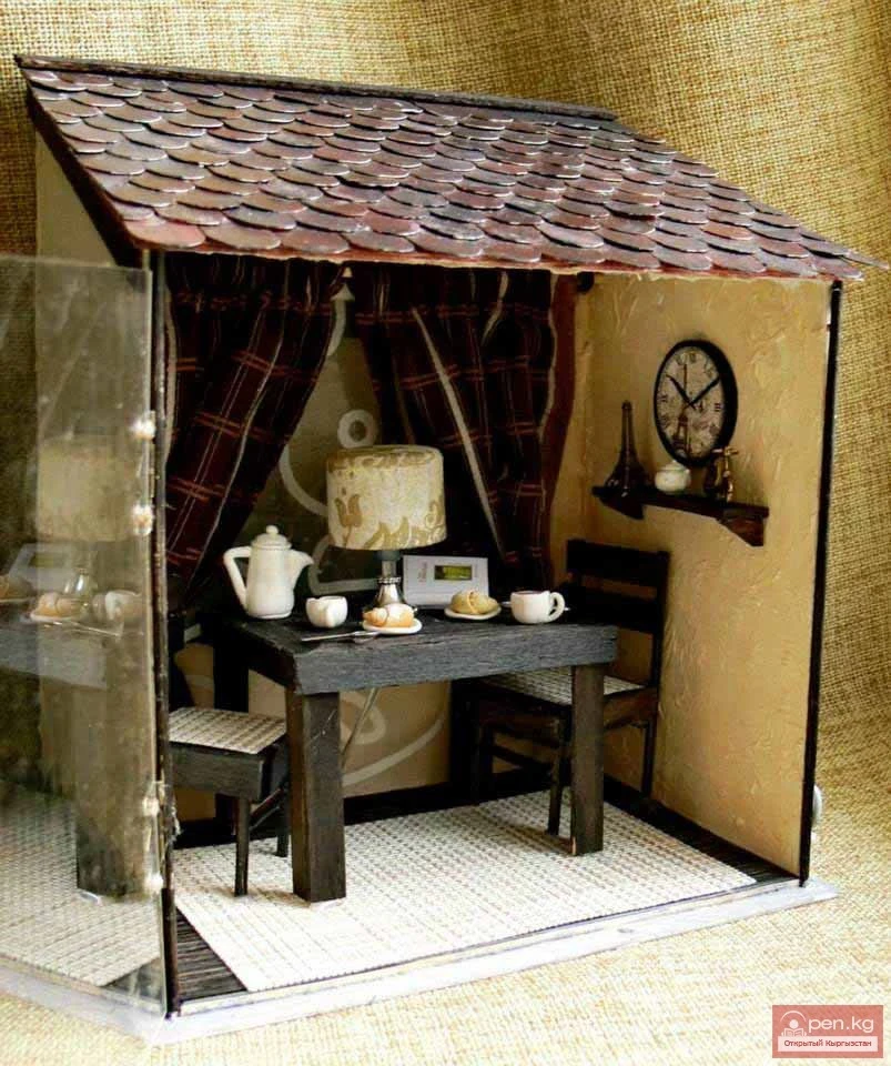 - Менин чыгармачылыгым дүкөндө сатылган жөнөкөй үлгүдөн башталды, аны кол менен жыйнашыбыз керек болчу. Ал жыйналган, алыска коюлган, жана убакыт өткөндөн кийин мен аны ыргытууну пландаштырганда... колум көтөрүлбөй калды. Ошондо мен аны кайра жасадым, камин, кресло жасап, жарык өткөрдүм. Мен интернетте ушундай көп иштерди көрүп, бүтүндөй коллекция түзүүгө кызыктым. Бул үйчүктөр чыныгы үйчүктөргө абдан окшош, бир гана айырмачылык - алар өтө кичинекей, жана мен бул "чындыкка" жетишүүгө умтулушум керек экенин түшүндүм, ошондуктан мен кичинекей деталдарга көбүрөөк көңүл бура баштадым - штукатурка, черепица жана интерьер буюмдары. Мен түзгөн ар бир үйчүктүн кооздугу биринчи кезекте мага жакат, жана мен дайыма өзүмдүн жашоомдо да ушундай ыңгайлуу болорун ойлойм. Көп адамдар мага бул бөлмөлөрдүн тургундары жоктугу үчүн ыраазычылык билдиришет, анткени ар бир адам аны карап, ээси болуп элестете алат.