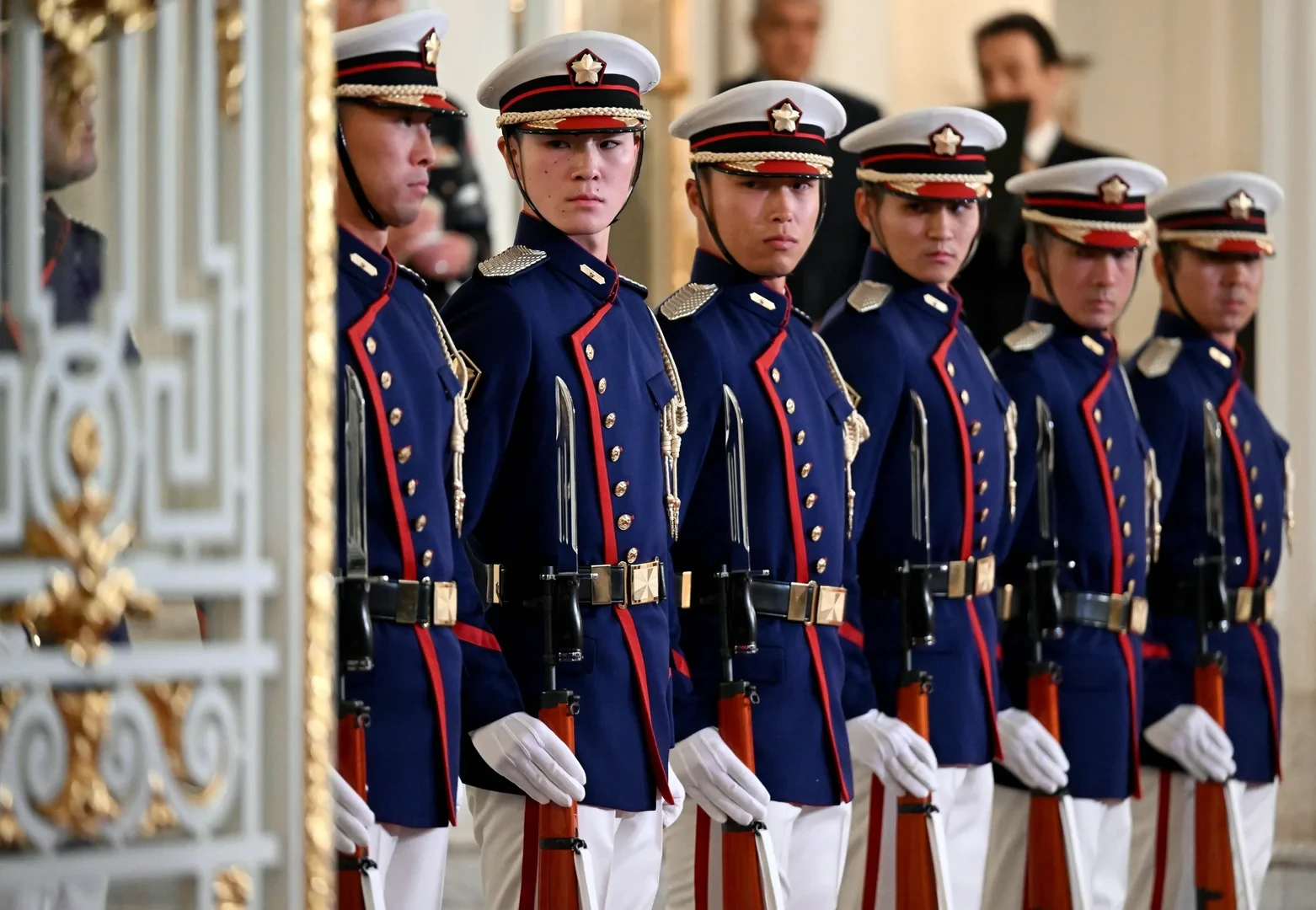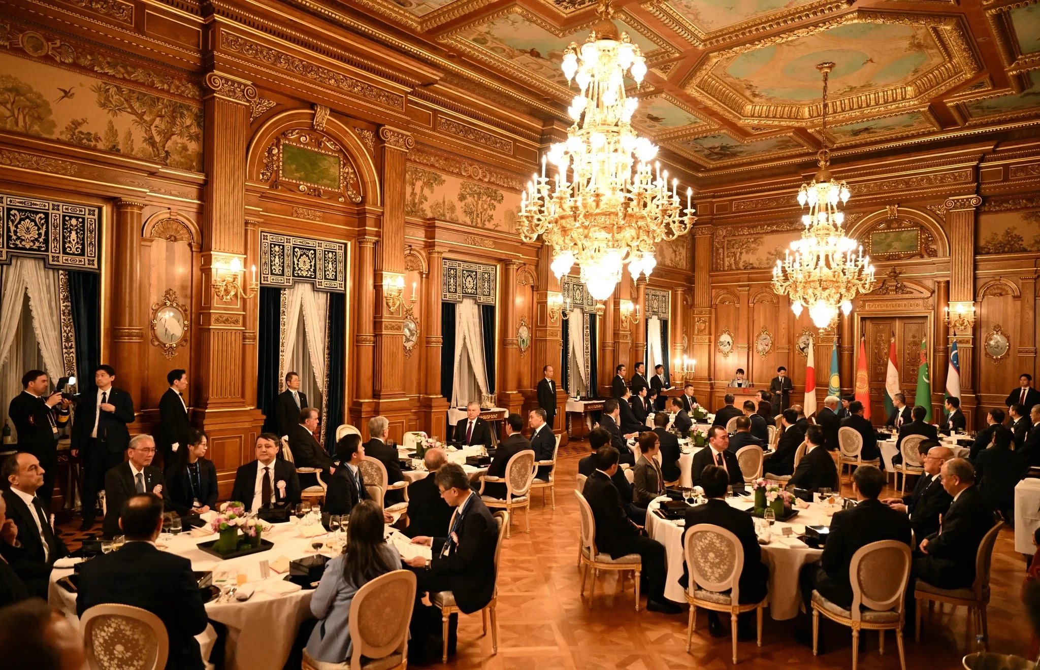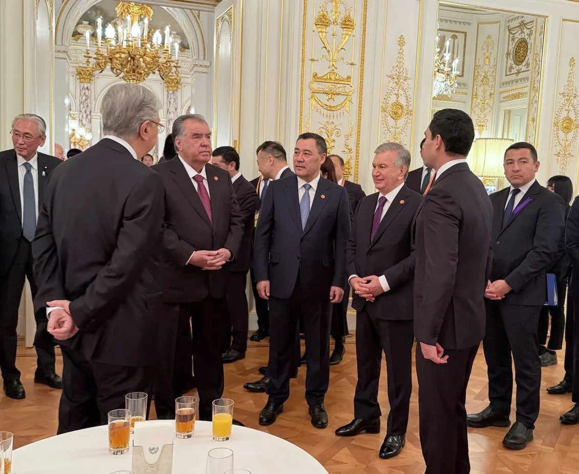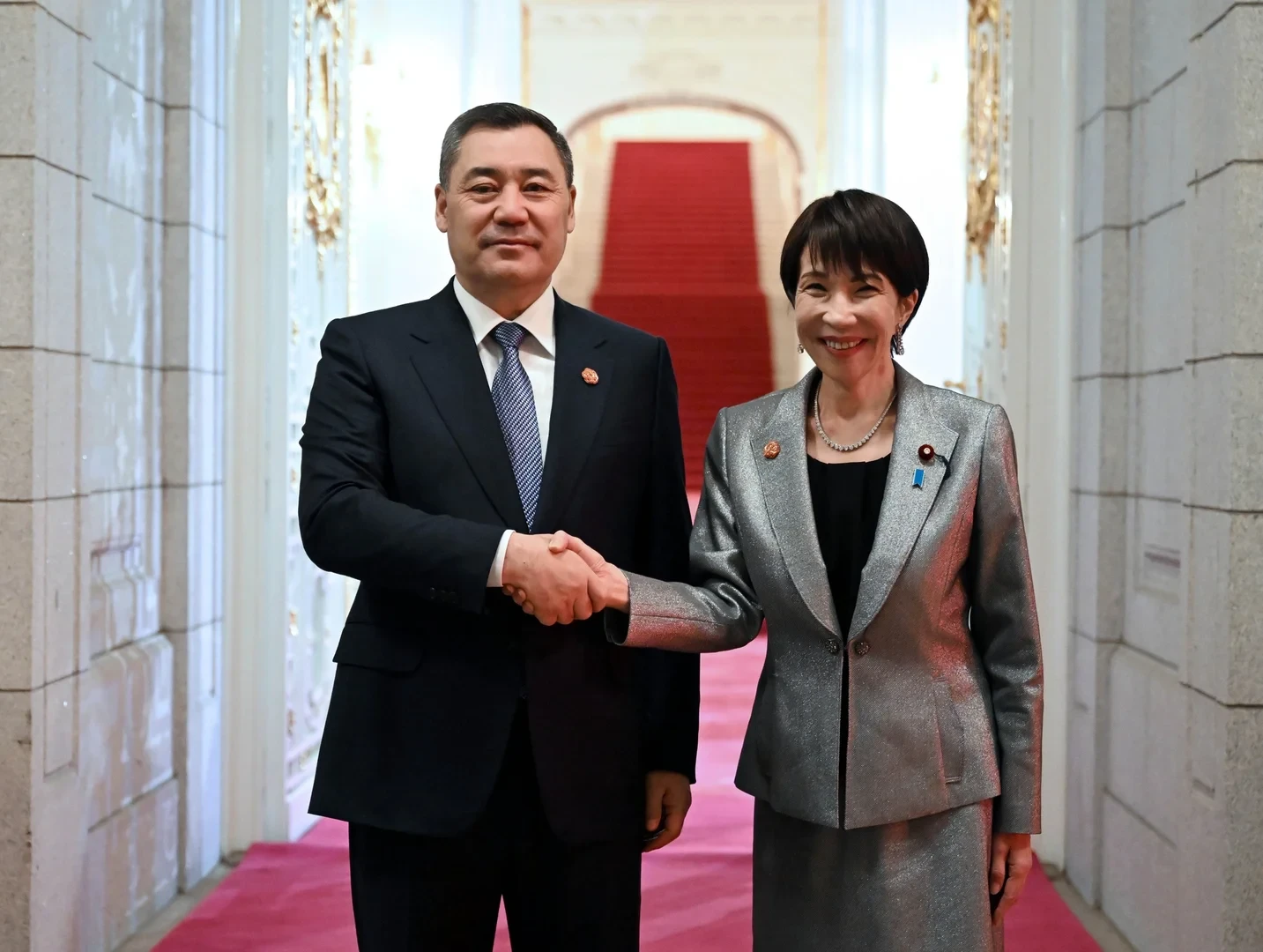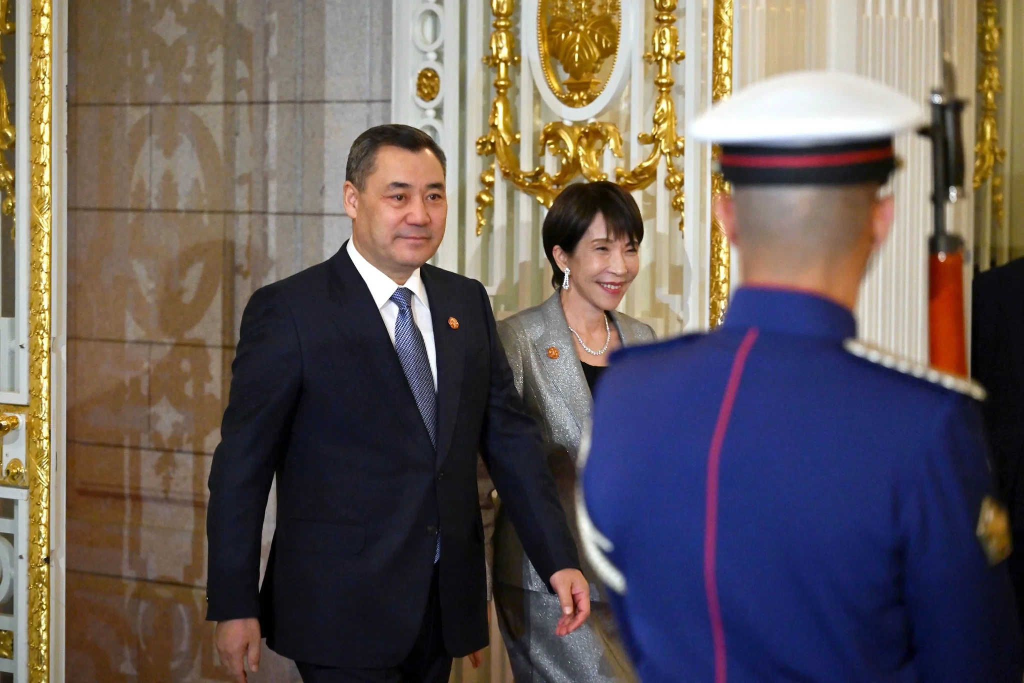Андан кийин президент Садыр Жапаров жана премьер-министр Санаэ Такаити кызыл килем боюнча өтүп, аларды урматтуу караул тосуп алып, андан соң Ортолук Азия өлкөлөрүнүн лидерлери үчүн уюштурулган тосуп алуу кечесине баруудан мурун биргелешип сүрөткө түштү. ```