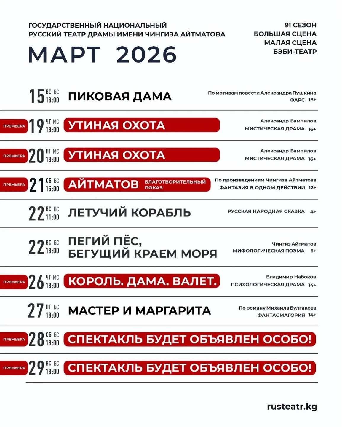 Бишкекте, Чынгыз Айтматов атындагы Мамлекеттик улуттук орус драма театрында 2026-жылдын март айына программа жарыяланды.