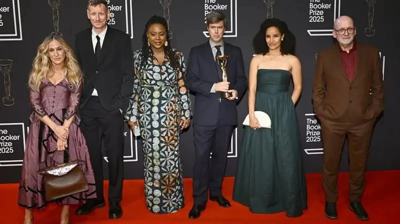 Дэвид Салэй (ортодо) калыстар тобунун мүчөлөрү менен (солдон оңго): Сара Джессика Паркер, Крис Пауэр, Айобами Адебайо, Кайли Рид жана төрага Родди Дойл 2025-жылдагы Букер сыйлыгын тапшыруу аземинде. Сүрөт Getty Images.