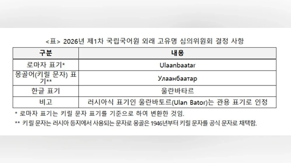 Маданият министрлиги жана Корей тилинин улуттук институту «2026-жылдагы чет элдик жеке аттар боюнча Корей тилинин улуттук институтунун биринчи жыйынын» өткөрүшүп, Монголиянын борборунун хангыл жазуусундагы маселени чечүү үчүн жыйын өткөрүштү. Талкуулоолордун натыйжасында жергиликтүү айтылышты эске алган «Улаанбаатар» жазуусун колдонуу чечими кабыл алынды.