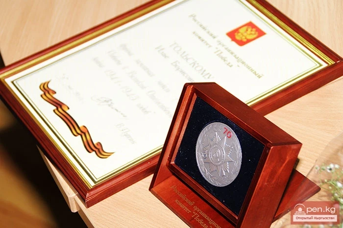 Андан соң Россиянын Кыргызстандагы элчиси Андрей Крутко "70 жыл Улуу Ата Мекендик согуштагы Жеңиш үчүн" грамоталарын жана эстелик медалдарын Россия президенти Владимир Путиндин атынан кыргызстандык ардагерлерге жана патриоттук тарбиялоодо активдүү иш алып барган россиялык мекендештерге тапшырды.