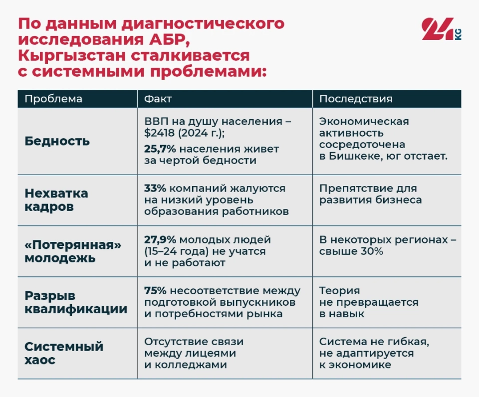 «Программанын негизги максаты — билим берүүнү жана экономиканы байланыштырууга, колледждерди жаштар акча табууну үйрөнгөн, жумуш күтпөгөн жерлерге айландыруу», — деп белгиленет АБРдин отчетунда.