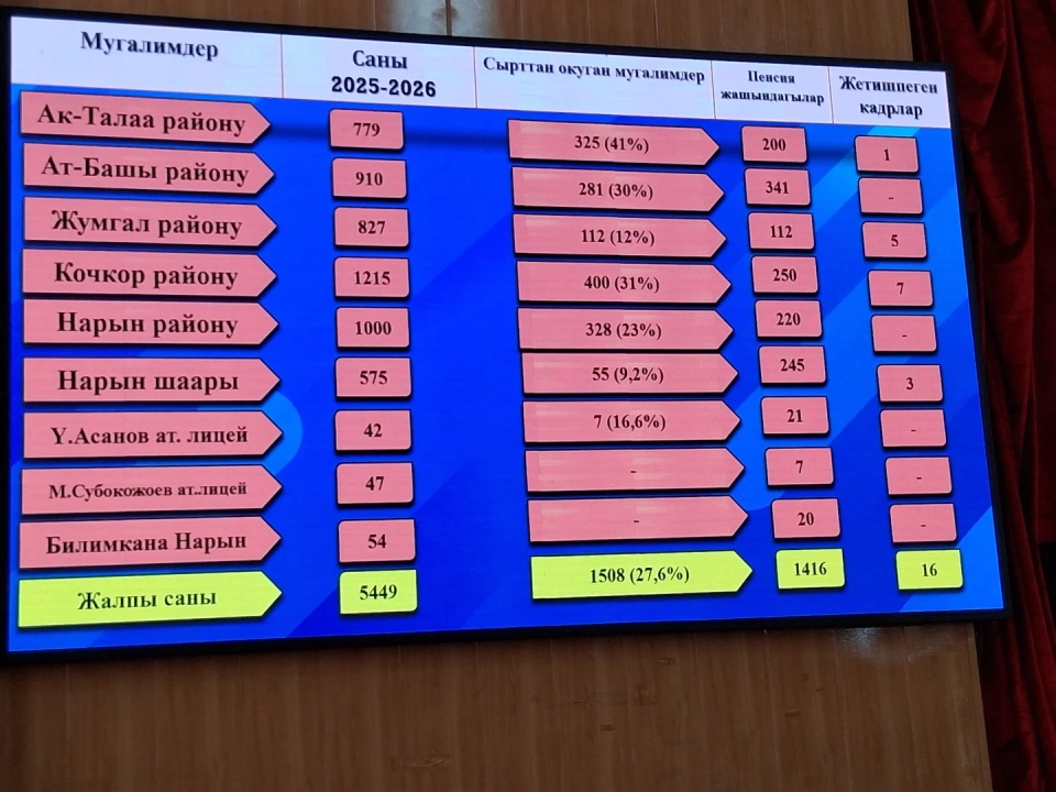 Учурда Нарын облусунда 143 мектепте 60 миңден ашык окуучу менен 5 миңден ашык мугалим иштөөдө. Алардын ичинен 1 400 пенсионер, 1 500ү кечки жана сырттан окуу бөлүмдөрүнүн畢業чылары, аларга заманбап окутуу методикалары боюнча тренингдер өткөрүлүүдө.