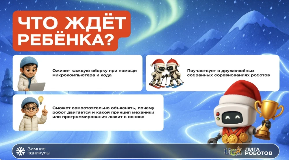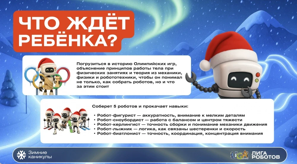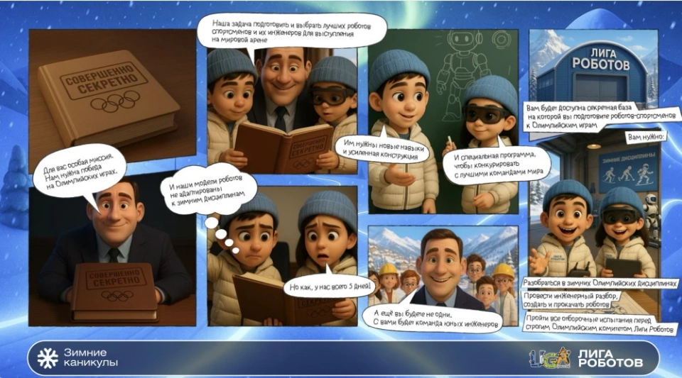 Балдар роботторун модернизациялоо, механизмдерди тестирлөө, ошондой эле кызыктуу оюн атмосферасында ар кандай "олимпиадалык тесттерди" өткөрүшөт жана командаларда иштешет.