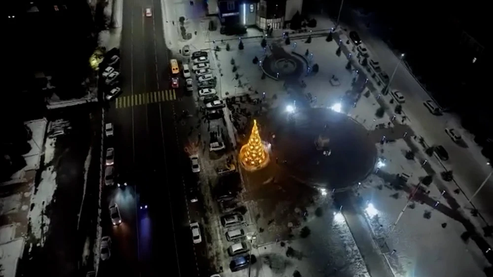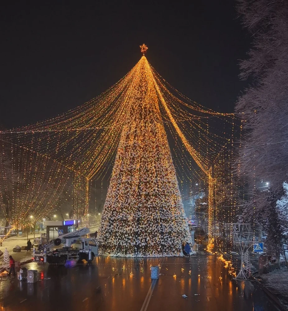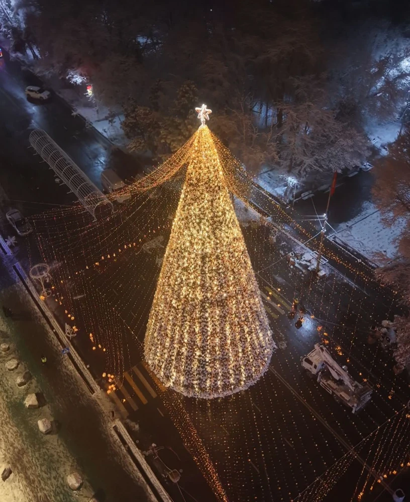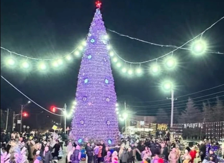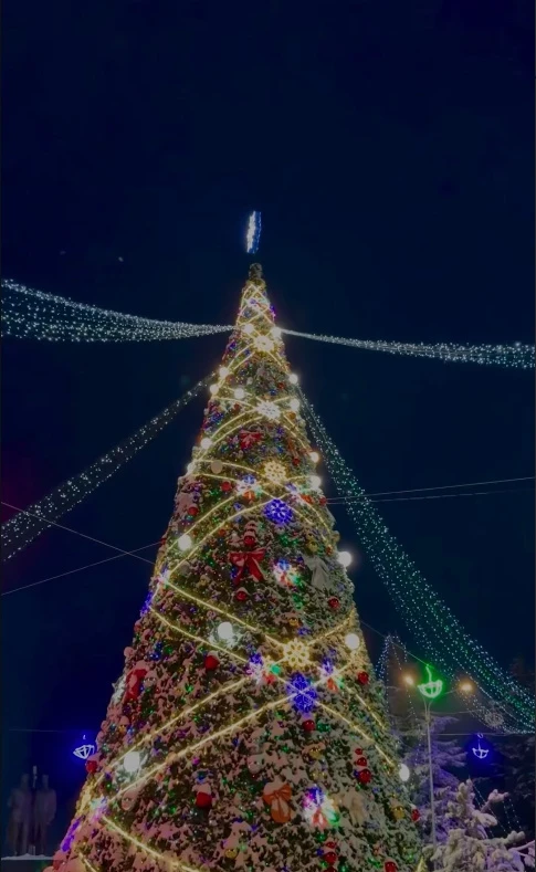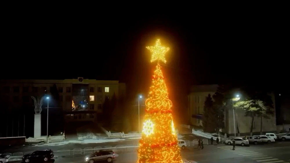 Токмок дагы өзүнүн жаңы жылдык сулуусун сунуштады, ал узун гирляндалар менен кооздолгон, майрамдык атмосфераны жаратууда.