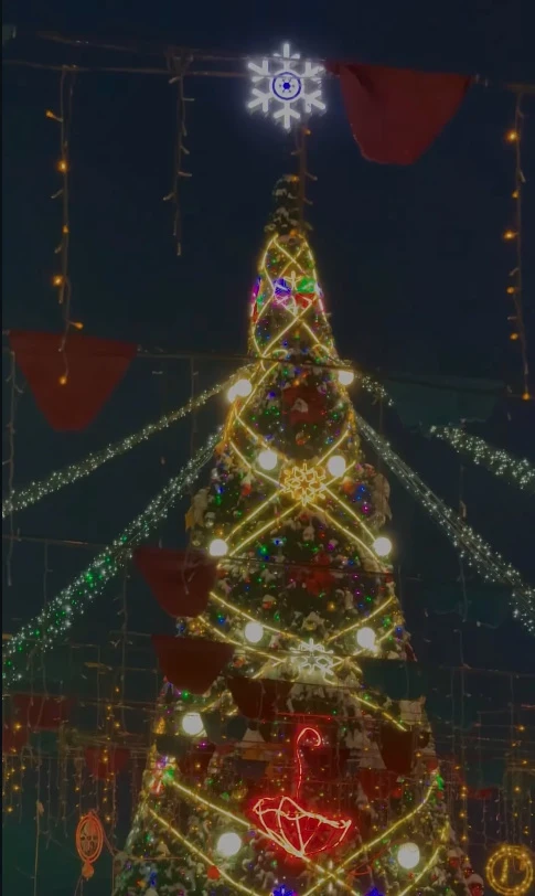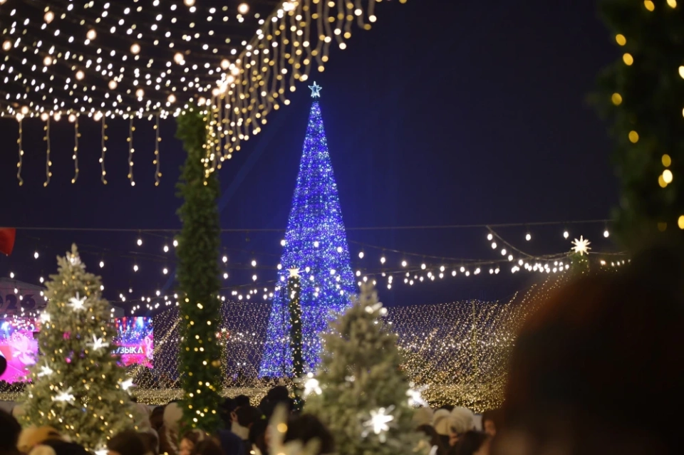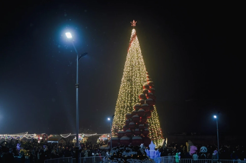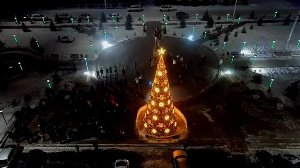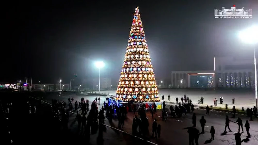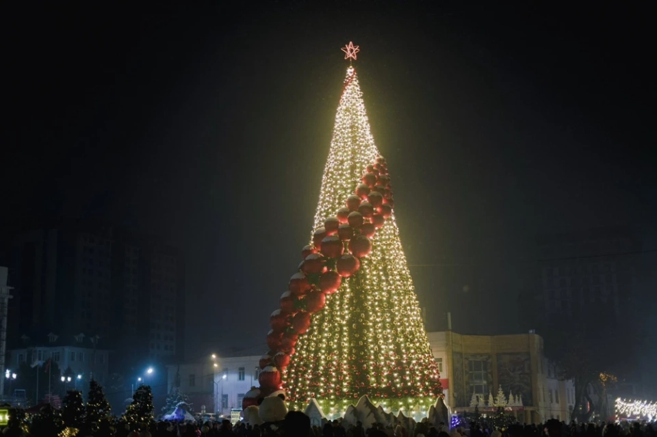 Токмок дагы өзүнүн жаңы жылдык сулуусун сунуштады, ал узун гирляндалар менен кооздолгон, майрамдык атмосфераны жаратууда.