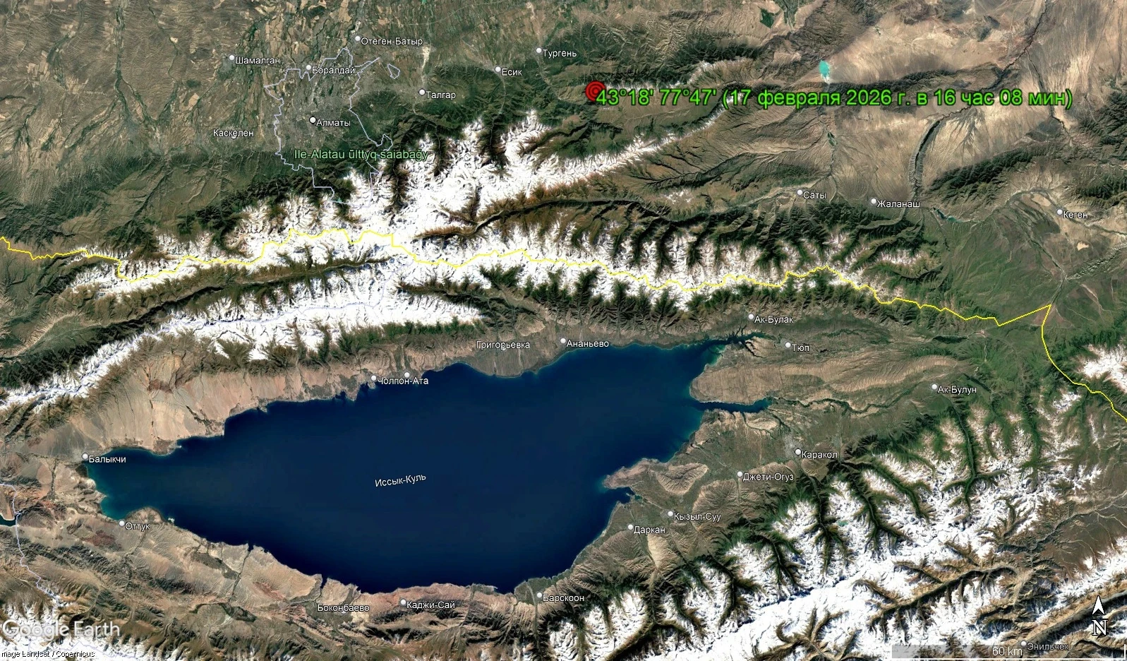 Алдын ала маалыматтар боюнча, эпицентр Казакстан аймагында, Ананьево айылынан 65 чакырым түндүк-чыгышта жана Алматыдан 70 чакырым түндүк-чыгышта жайгашкан.