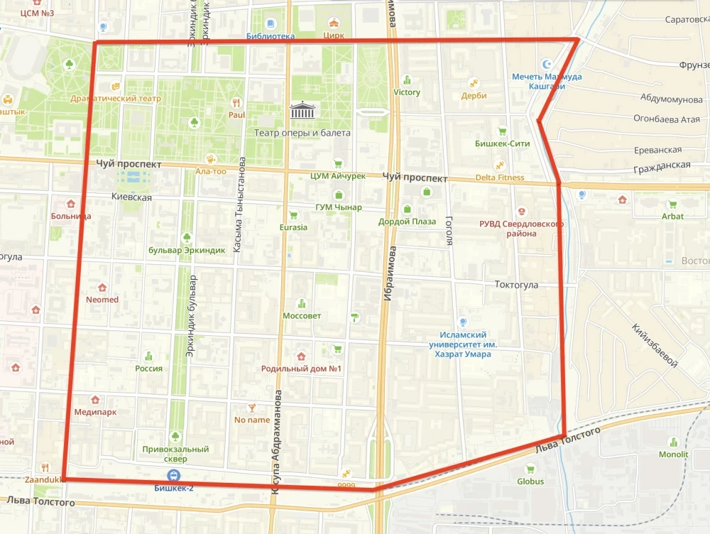 - темир жолдун линиясынан Матросов көчөсүнө, Горький көчөсүнө, Гвардейский көчөсүнө, Бектенов көчөсүнө, Скрябин көчөсүнө, Мавлянов көчөсүнө жана 7-апрель көчөсүнө;