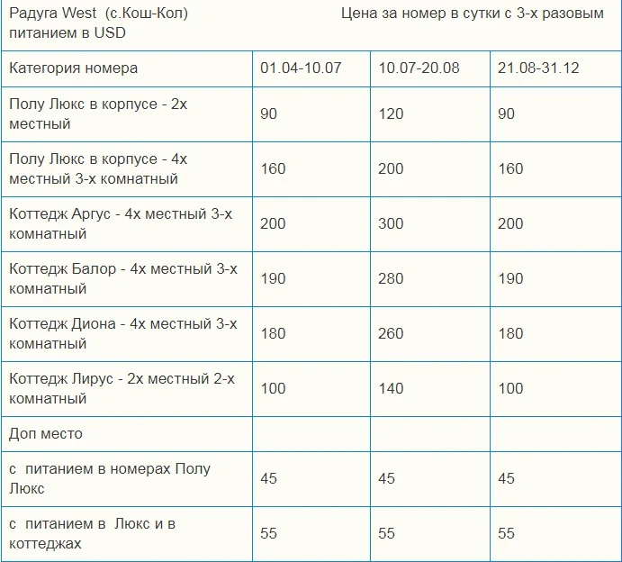 Люкс-коттедждер жеке сектордо 3 мезгилдик тамактанууну камтыбайт. Баасы коттеджди ижарага алууну жана термалды-минералдык суусу бар бассейнге кирүүнү камтыйт.