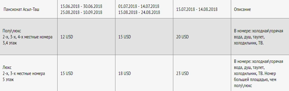 Асыл-Таш пансионатында бир адамга суткасына жашоо баасы. Бааларга тамак-аш кирбейт.