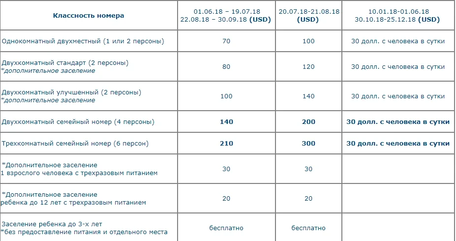 Баалар 2 адамга эсептелген номер үчүн суткасына; 4 адамга эсептелген эки бөлмөлүү «үй-бүлөлүк» үчүн; 6 адамга эсептелген үч бөлмөлүү «үй-бүлөлүк» үчүн; АКШ долларында көрсөтүлгөн.