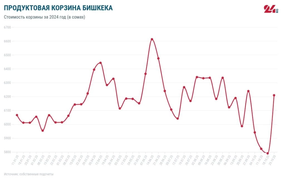 С начала нашего мониторинга в конце октября 2018 года, общая стоимость продуктовой корзины возросла на 2 тысячи 940 сомов. В сравнении с аналогичным периодом 2024 года наблюдается увеличение на 442 сома, а с начала текущего года — на 143 сома.