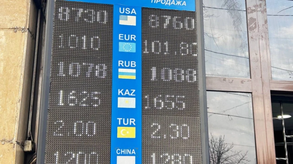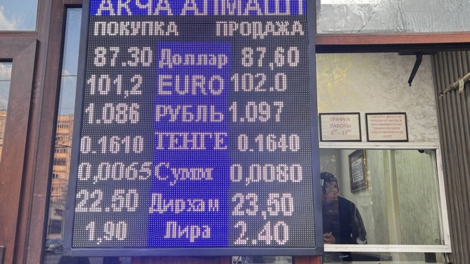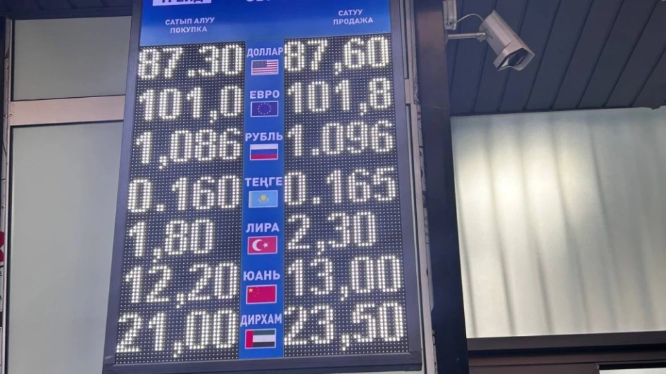 Рубль также показал снижение: его стоимость составляет 1,07-1,08 сома при покупке и 1,08-1,09 при продаже.