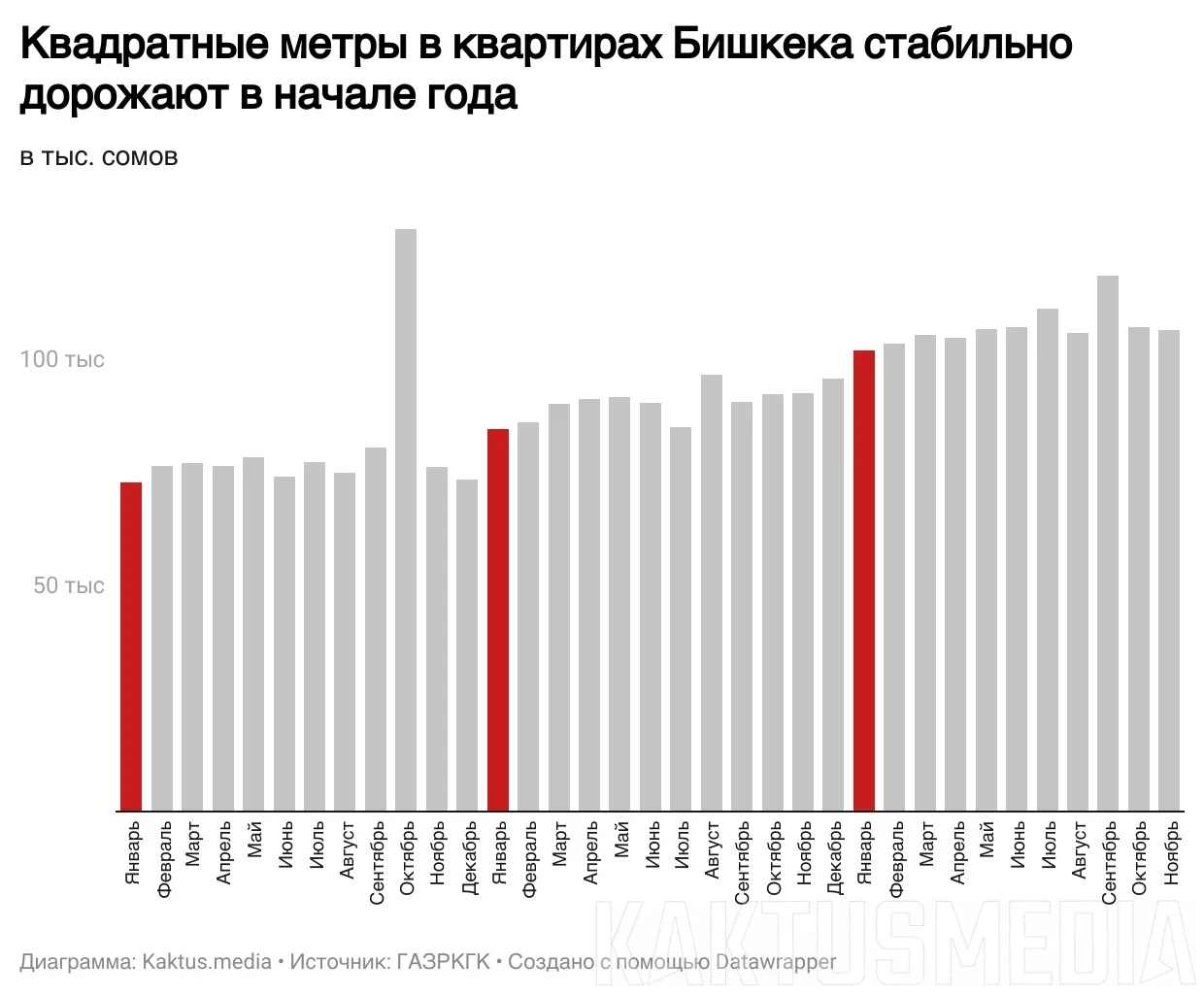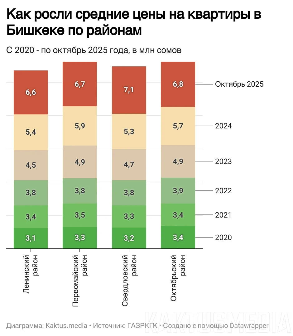Согласно данным за октябрь, средняя стоимость квартир составила: 7 миллионов сомов в Свердловском районе, 6,8 миллиона сомов в Октябрьском, 6,7 миллиона сомов в Первомайском и 6,6 миллиона сомов в Ленинском.