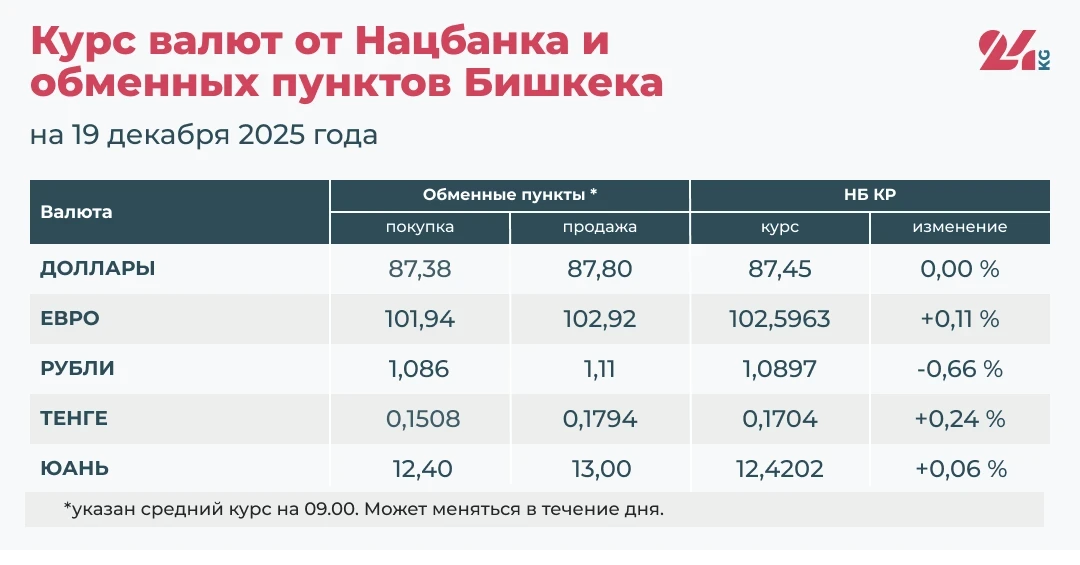 По последним данным, предоставленным Национальным банком Кыргызстана и обменными пунктами Бишкека, наблюдается рост курсов евро, казахстанского тенге и китайского юаня, в то время как российский рубль продолжает снижение. Курс доллара США остается стабильным.