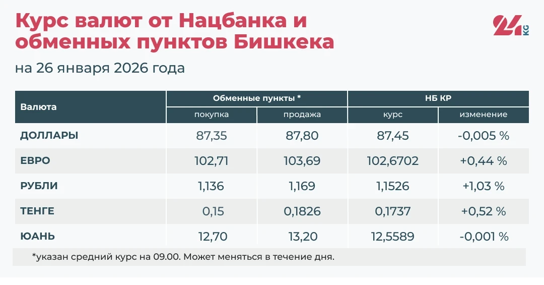 По данным Национального банка Кыргызстана и обменных пунктов в Бишкеке, на 26 января наблюдается рост курсов евро, российского рубля и казахстанского тенге, тогда как доллар США и китайский юань демонстрируют небольшое снижение. Доллар остается стабильным.