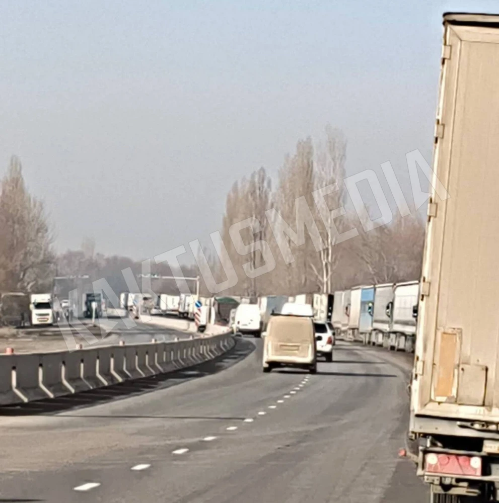 По их словам, причина заторов кроется в задержках, возникающих при проверке грузовиков на казахском КПП "Карасу".