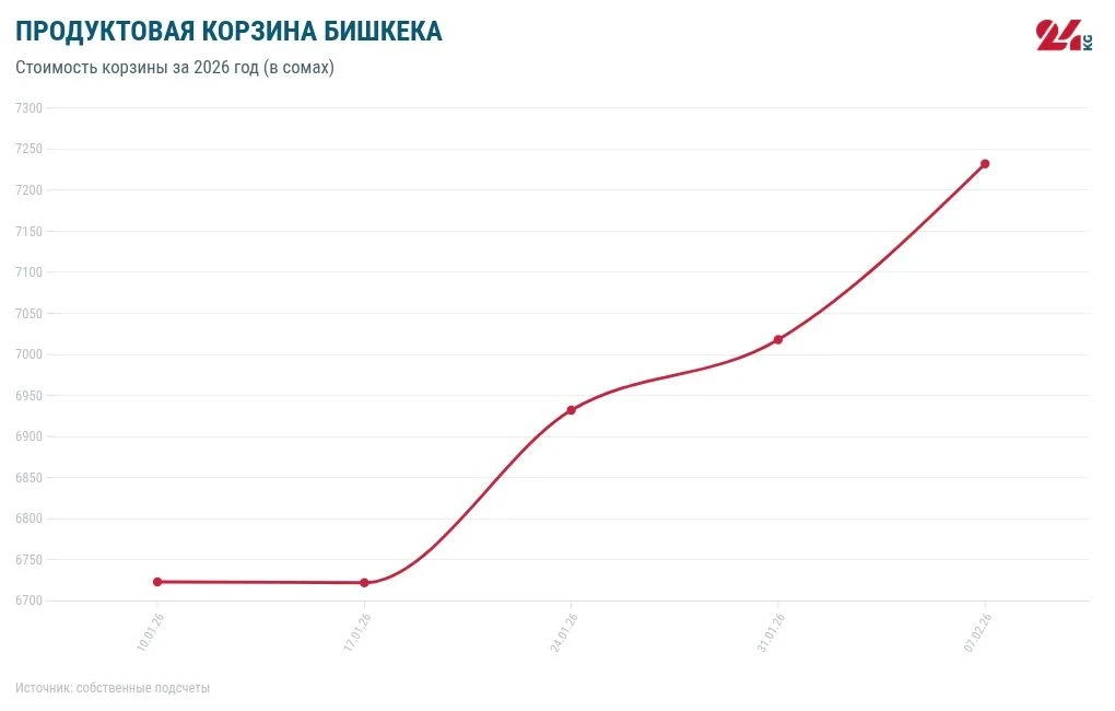 В течение 2025 года стоимость продуктовой корзины увеличилась на 686 сомов. Минимальная цена была зафиксирована 18 октября — 5 тысяч 791 сом, а максимальная — 6 декабря — 6 тысяч 927 сомов.