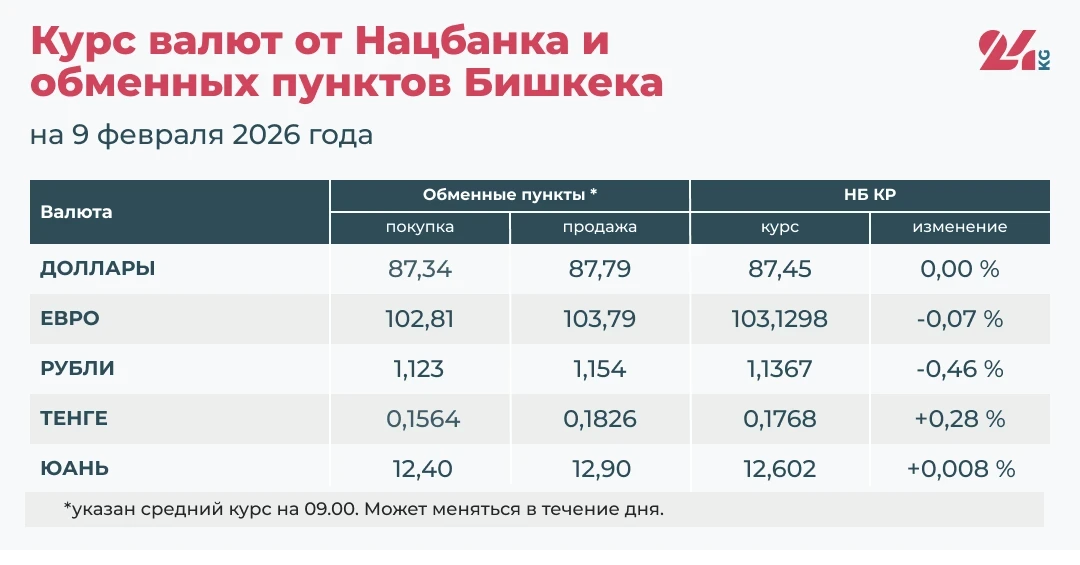 Согласно данным Национального банка Кыргызстана и обменных пунктов Бишкека, курсы казахского тенге и китайского юаня увеличились, в то время как евро и российский рубль показали снижение. Курс доллара США остался неизменным.