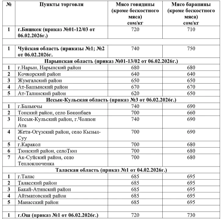 В соответствии с приказом Министерства экономического комплекса Кыргызской Республики, датированным 30 января 2026 года под номером 3 и касающимся введения временного государственного регулирования цен на мясо (говядина и баранина, исключая бескостное мясо) на всей территории страны, установлены новые максимальные цены, которые определили территориальные отделы Службы антимонопольного регулирования: