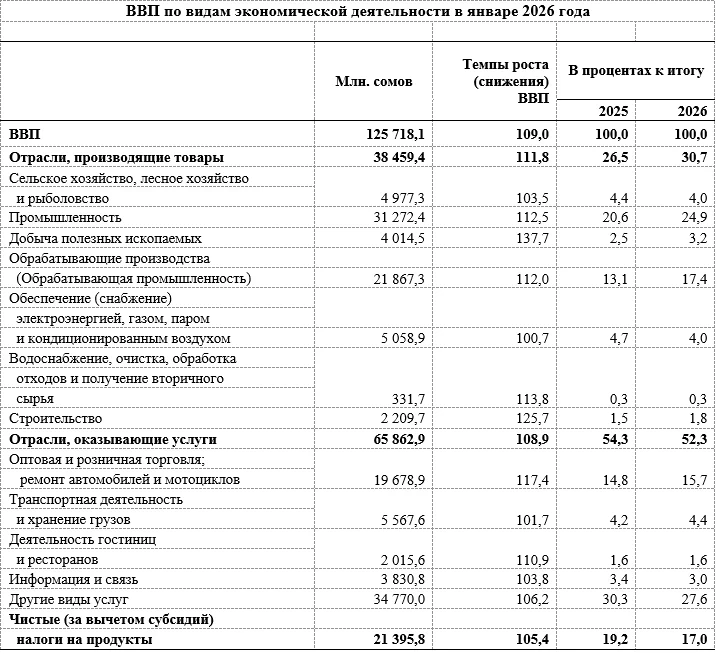 Согласно информации, предоставленной Национальным статистическим комитетом, валовой внутренний продукт (ВВП) в январе 2026 года составил 125,7 млрд сомов, что на 9% больше по сравнению с аналогичным месяцем предыдущего года.