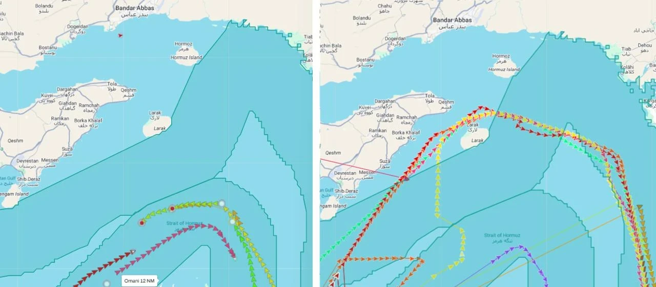 Фото СМИ. Слева стандартный маршрут прохода через Ормузский пролив и справа новый маршрут через остров Ларак