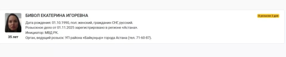 По имеющимся данным, Екатерина Бивол объявлена в розыск по инициативе МВД Казахстана. Дело было зарегистрировано 1 ноября 2025 года в Астане, а его расследование осуществляется полицией Байконыра.