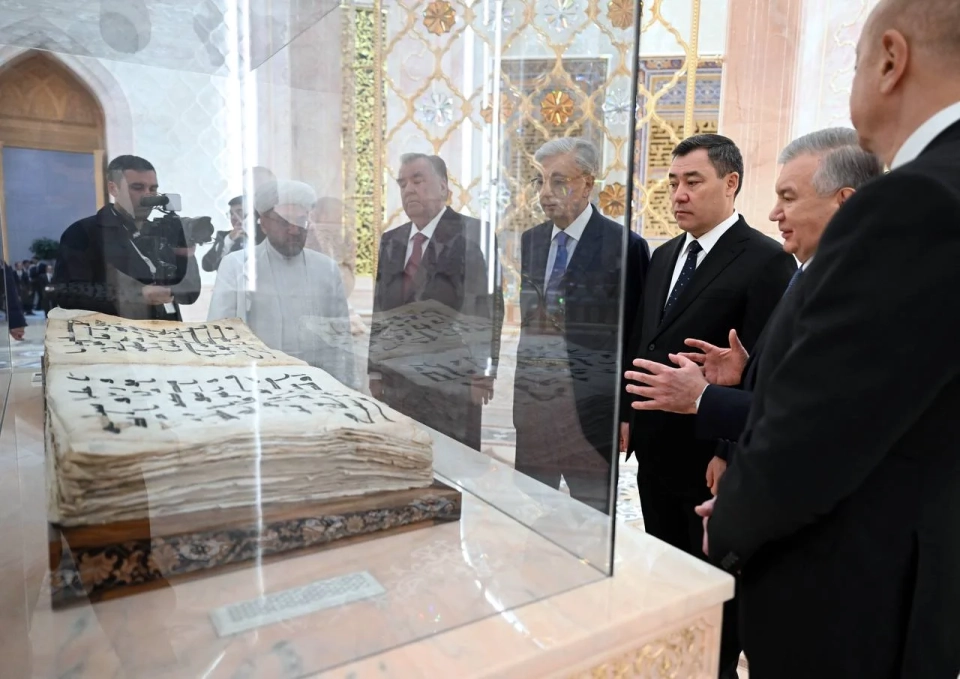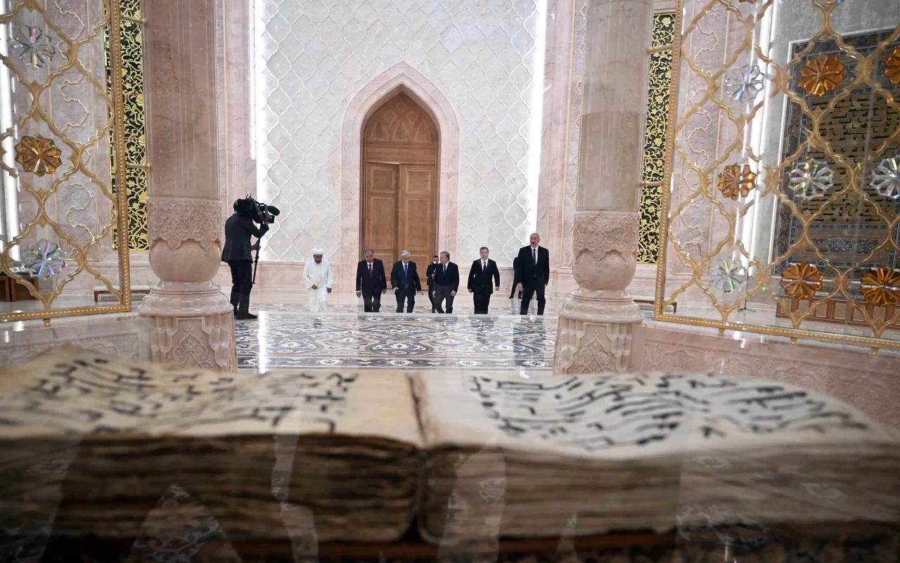 Садыр Жапаров, вместе с лидерами Азербайджана, Казахстана и Таджикистана, посетил зал Священного Корана, где хранится Мусхаф Усмана — одна из самых древних и почитаемых рукописей в исламском мире.