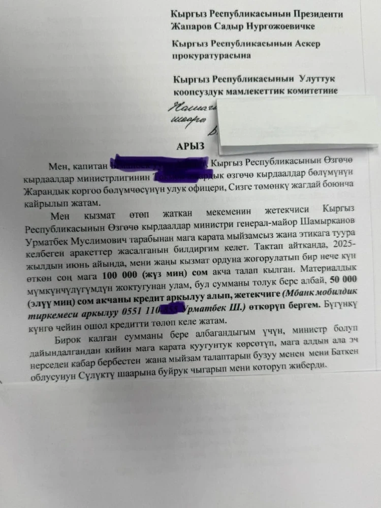 По словам Алагозова, в частности, в 2025 году Шамырканов требовал деньги за повышение в должности одного из сотрудников министерства. Сотрудник утверждает, что половина оговоренной суммы была переведена на электронный кошелек Шамырканова, который на тот момент был заместителем министра. После назначения Шамырканова на пост министра, сотрудник заявил, что не может передать оставшуюся часть взятки, после чего министр перевел его на работу в Баткенскую область.