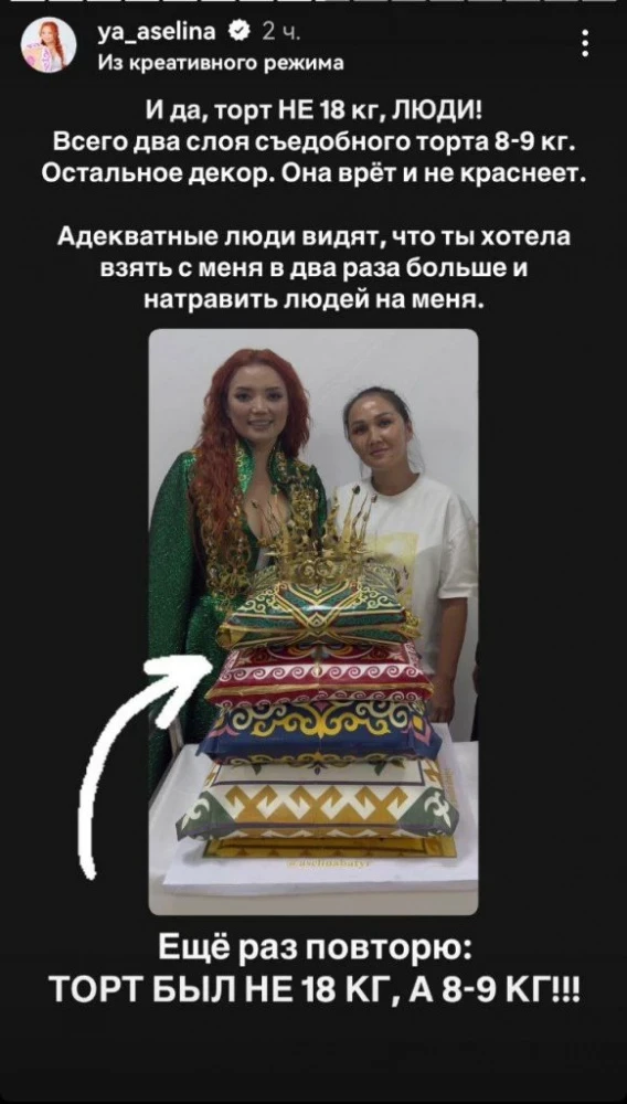 Блогер Аселина Батыр, в свою очередь, заявила, что вес торта составил "не 18, а 8-9 кг", добавив, что остальное было декором. В своем Instagram она утверждала, что перевела кондитеру предоплату в размере 100 тыс. тенге и приложила скриншот переписки для подтверждения.