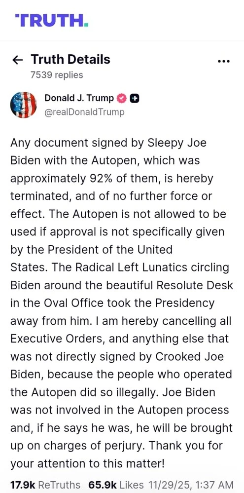 В публикации Трампа также отмечается, что «Джо Байден не принимал участия в процессе подписания с помощью Autopen. Если он попытается это опровергнуть, ему грозит обвинение в лжесвидетельстве».
