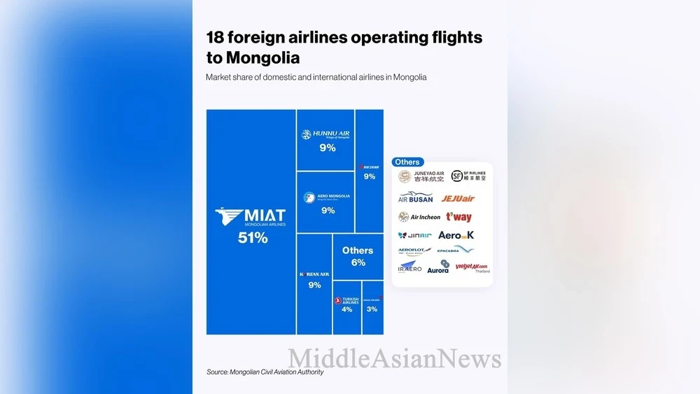 В Монголию осуществляют рейсы 18 иностранных авиакомпаний. На данный момент наибольшее количество рейсов выполняется из Республики Корея, России и Китая (4 и 3 соответственно). Летние месяцы также увидят дополнительные рейсы из Турции и Таиланда, которые в сумме составят 10 116 рейсов по 22 направлениям.