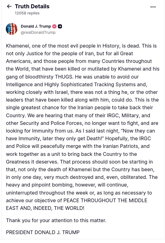 По словам Трампа, Хаменеи, вероятно, стал жертвой авиаударов, произведённых по объектам на иранской территории. Эта информация была опубликована в его социальных сетях.