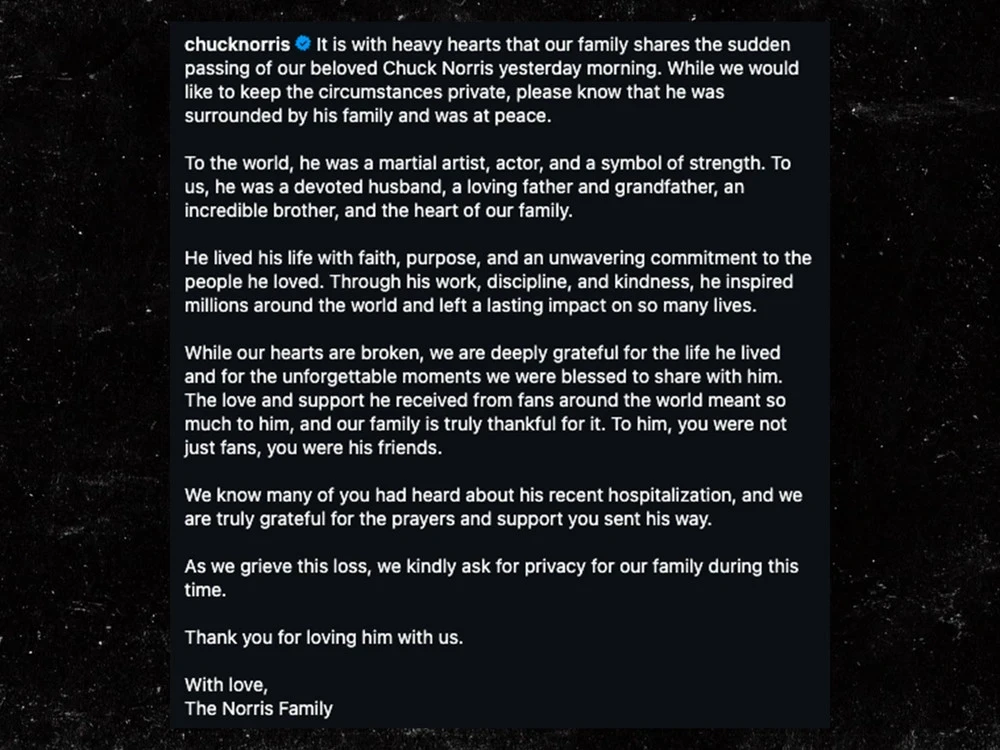 Умер актер 19 марта на Гавайях. Семья Норриса сделала официальное заявление, в котором выразила глубокую скорбь и сообщила о его внезапной кончине. «Он был окружен любящими близкими и нашел мир», — отметили родные.