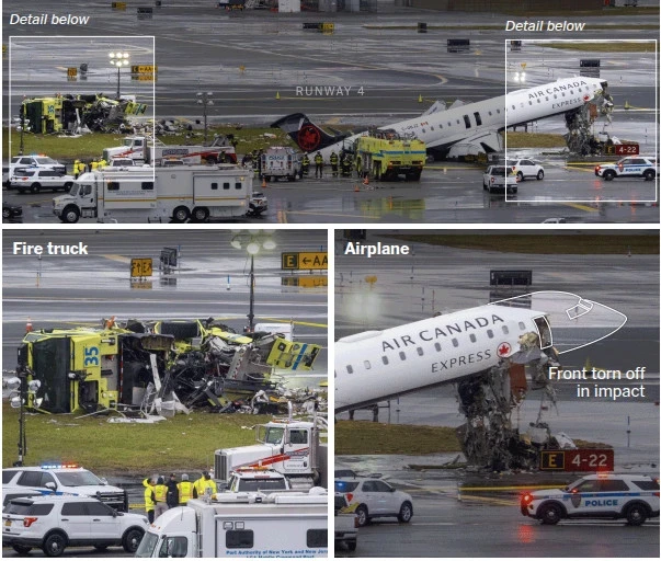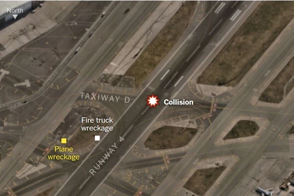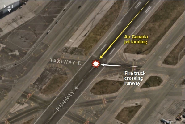 На видеозаписях с камер наблюдения, проанализированных газетой The New York Times, запечатлен момент, когда самолет Air Canada движется по взлетно-посадочной полосе и приближается к перекрестку, где пожарная машина запросила разрешение. В тот момент, когда пожарная машина поворачивала налево на взлетно-посадочную полосу №4, произошло столкновение, которое произошло около 23:37.