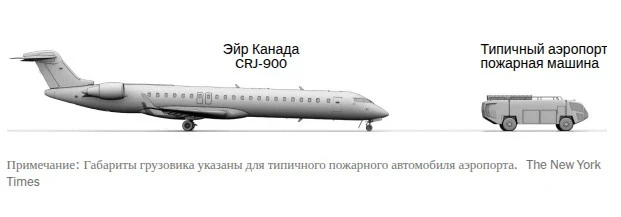 На схеме ниже показано, как выглядит реактивный самолет Bombardier CRJ-900 по сравнению с типичной аэропортовой пожарной машиной.