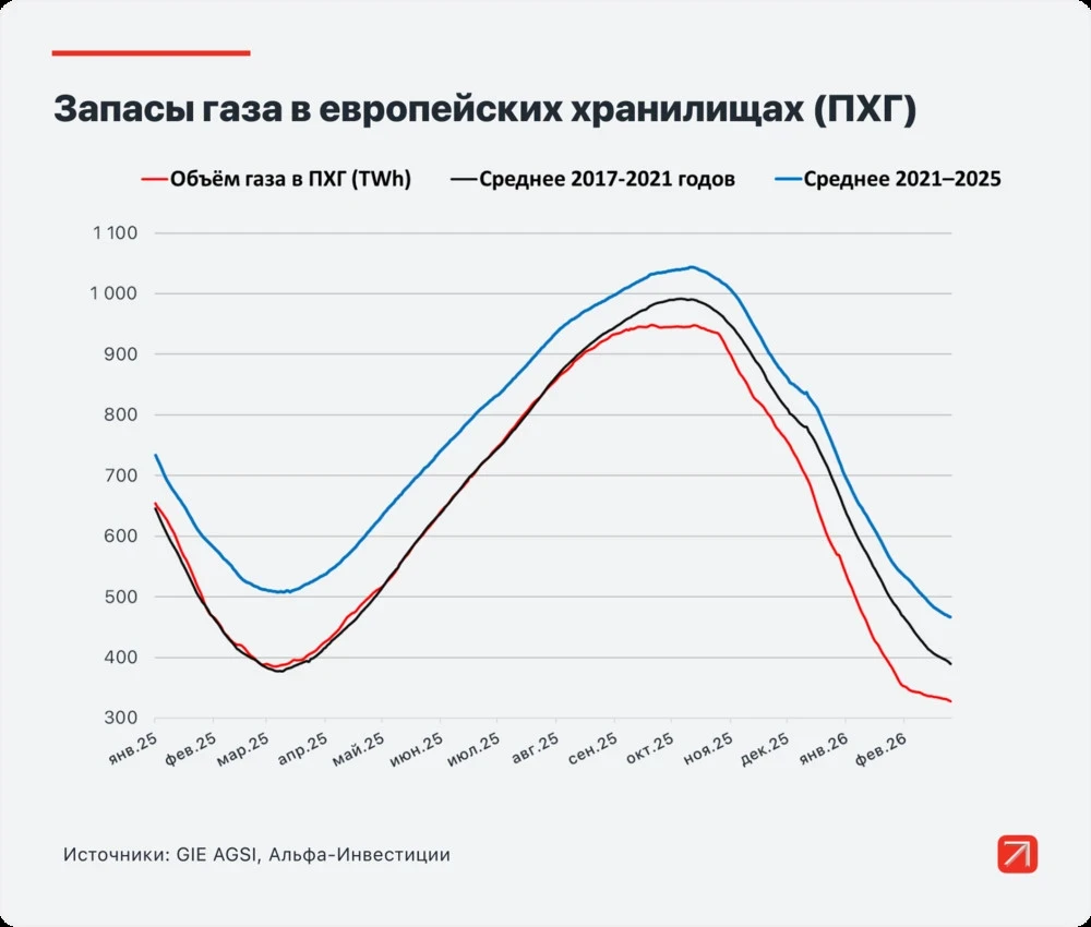 Это указывает на то, что к началу отопительного сезона 2026-2027 году Европе придется закупить значительно больше газа для хранилищ, чем обычно. Для достижения 90% заполненности к ноябрю местным трейдерам потребуется закупить около 67 миллиардов кубометров газа сверх обычного потребления, что составляет около 20% от общего объёма потребления газа в ЕС в 2025 году.